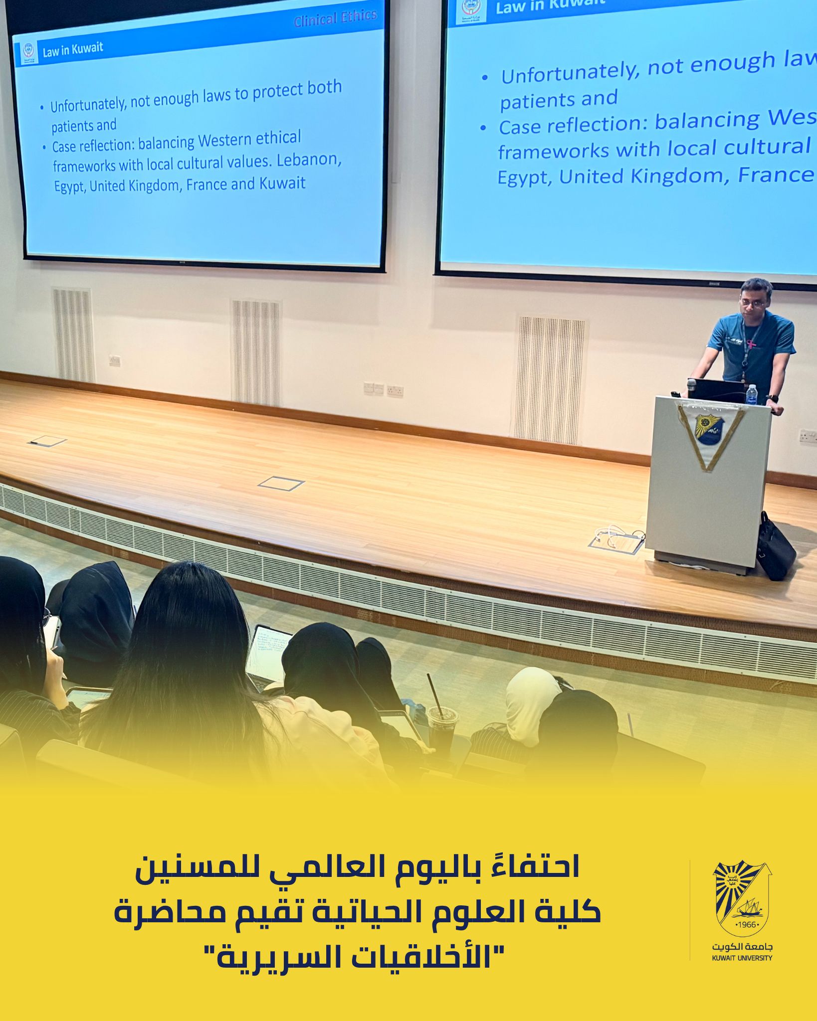 بمناسبة اليوم العالمي للمسنين، نظّم قسم اضطرابات التواصل بكلية العلوم الحياتية في جامعة الكويت محاضرة بعنوان "الأخلاقيات السريرية"، قدّمها اختصاصي النطق واللغة علي رجب، وذلك لطلبة مقرري الممارسة المهنية (2) والتدريب الميداني، تحت إشراف الدكتورة مرام الخالدي من قسم علوم اضطرابات التواصل.
