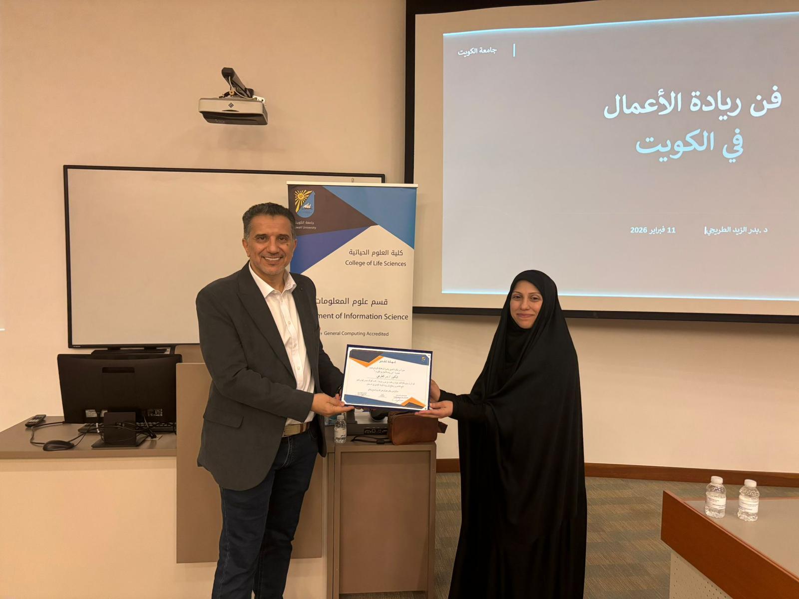 The Information Sciences Department at the College of Life Sciences organized a seminar titled “The Art of Entrepreneurship in Kuwait,” presented by leadership and organizational change specialist Dr. بدر الزيد الطريجي. The seminar was held at 12:30 PM on Wednesday, February 11, 2026, at the college.