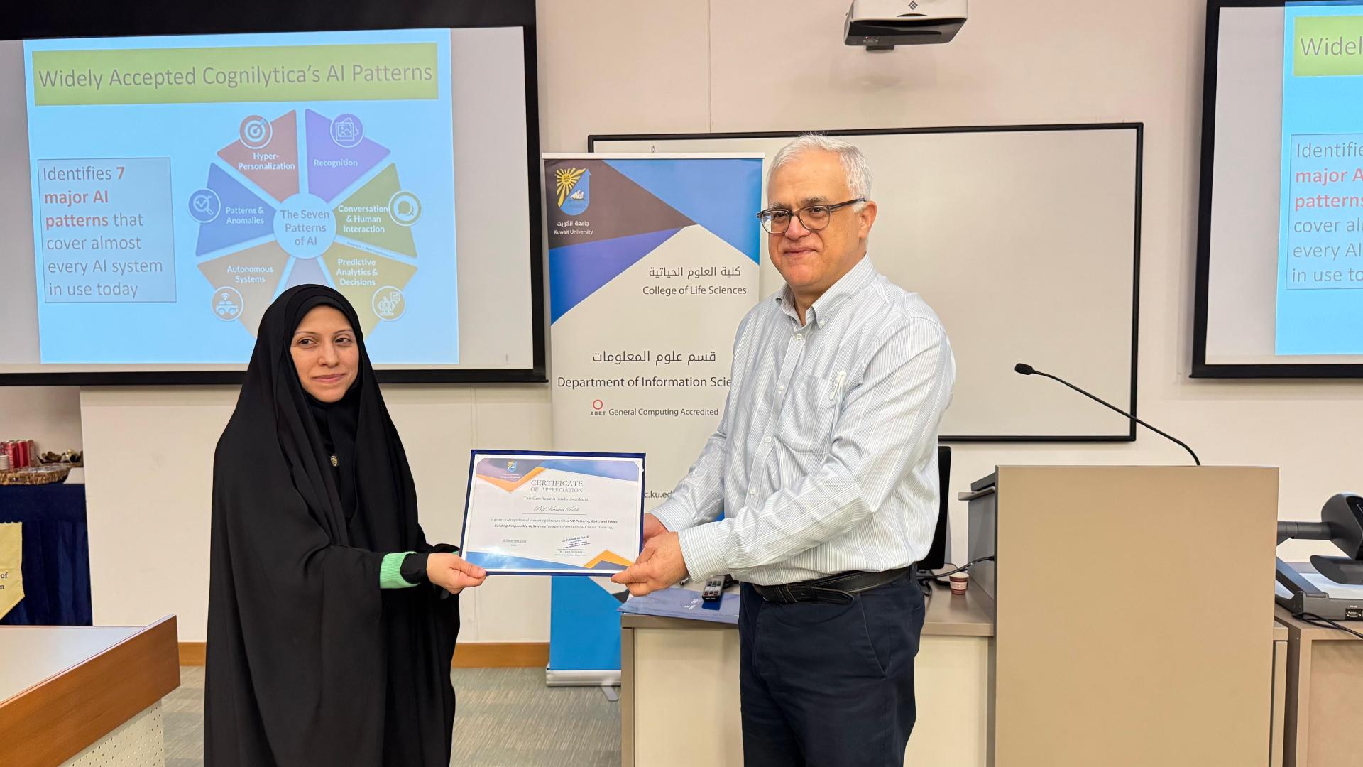 Professor Dr. Kasim Saleh began the lecture with a brief introduction to artificial intelligence. He then reviewed the various applications of AI and addressed the associated ethical risks, explaining how to mitigate and manage them responsibly. At the conclusion of the lecture, Dr. Fatima Hussein, Head of the Department's Social Committee, presented Professor Dr. Kasim Saleh with an award in recognition of his outstanding efforts and the valuable information he shared during the lecture.