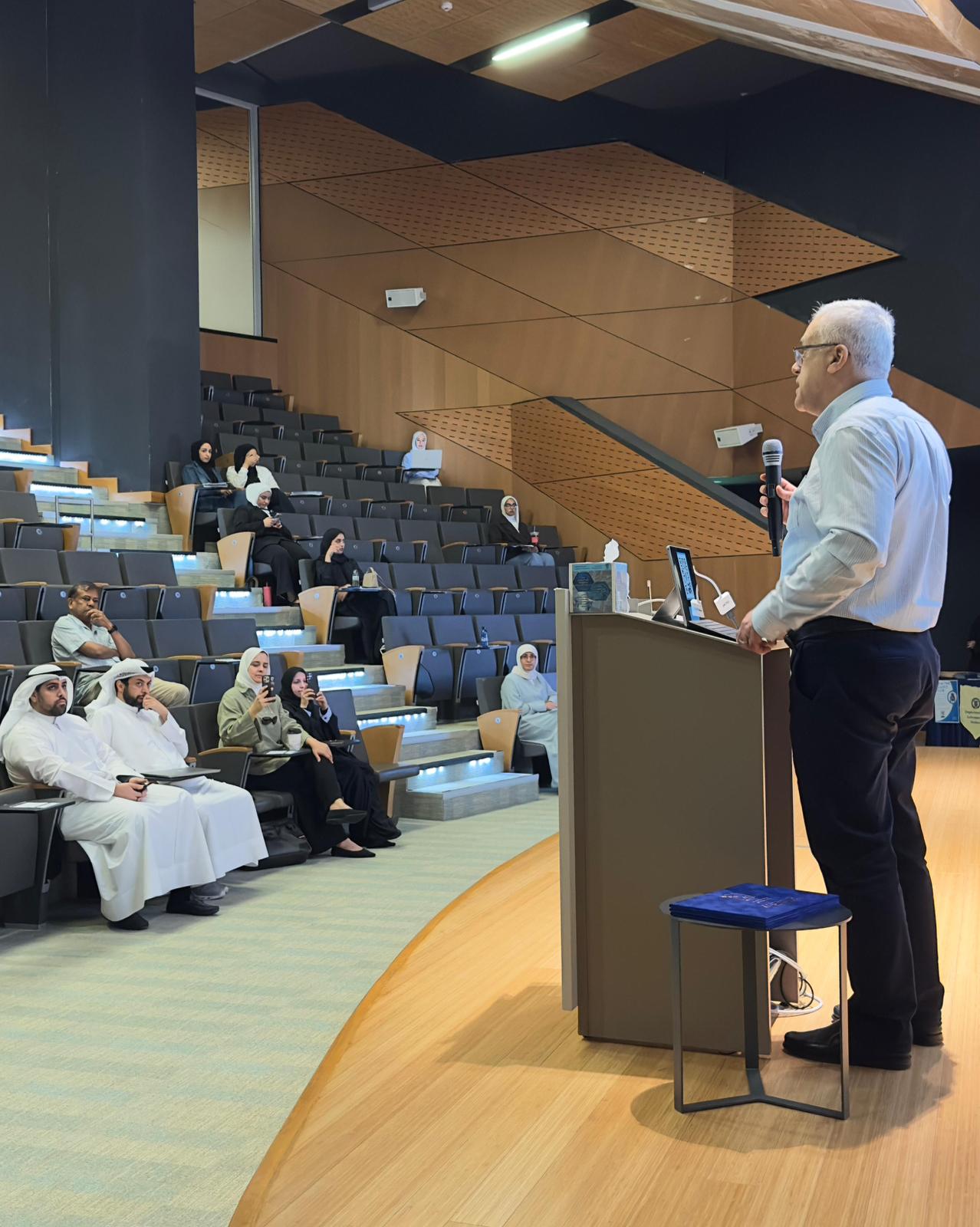 At the outset, the Acting Head of the Department of Information Science, Professor Kassim Saleh, welcomed the attendees, emphasizing the importance of students understanding new technologies that have become fundamental to many sectors. He noted that the university is working to keep pace with global developments by updating academic programs and providing advanced learning environments. On this occasion, Dr. Abdullah Al-Mutairi provided a comprehensive overview of artificial intelligence (AI), explaining the meaning of the term and outlining its origins and development. He also highlighted key applications used globally today, such as in the medical, industrial, and security sectors, among others. He further explained data science and how it can help predict the future based on current data. Following this, Dr. Luluah Al-Sumait, a faculty member in the Department of Information Science, welcomed the first cohort of students specializing in this field in Kuwait. She presented the curriculum for the "Data Science and Artificial Intelligence" program, detailing the core courses and practical skills students acquire, such as data analysis, machine learning, and the development of intelligent systems. She emphasized the department's faculty members' ongoing commitment to supporting and assisting students. In closing, she invited students to join the ClickIT Club, which will provide them with the necessary support throughout their studies.