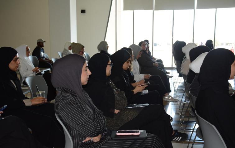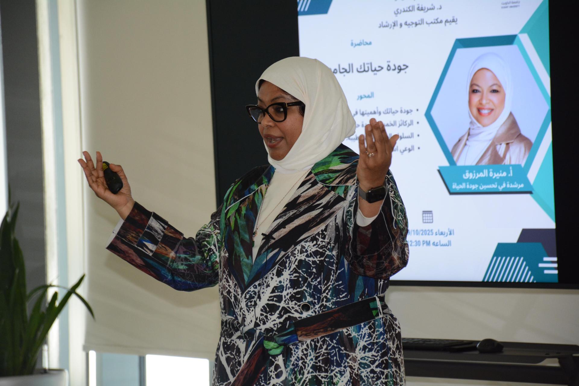 Ms. Al-Marzouq began by explaining the concept of quality of life from a comprehensive psychological and social perspective, highlighting its importance as a cornerstone for achieving balance between academic demands and the student’s personal and emotional needs. She emphasized the importance of students recognizing the factors that influence their daily quality of life on campus—such as the learning environment, social relationships, time management, and care for both mental and physical health.